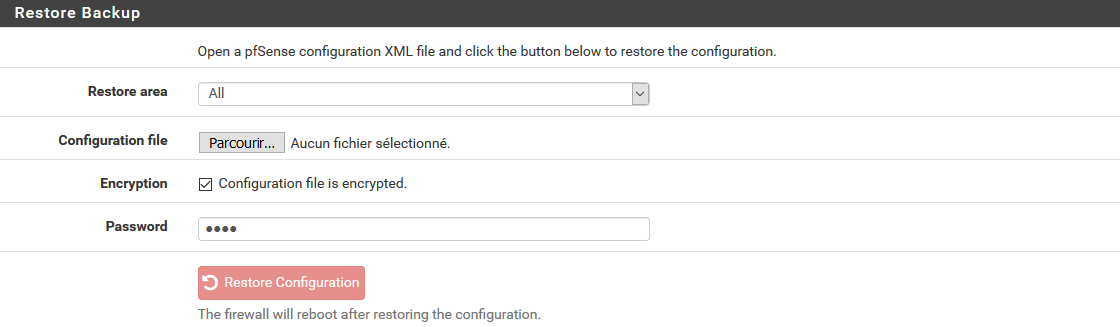 Dans tous les cas, une fois le deuxième pare-feu en ligne, retournez sur la page de gestion des sauvegardes et dans la deuxième zone, ajoutez votre fichier (champ Configuration file) et si votre sauvegarde est chiffrée, cochez la case Encryption et renseignez le mot de passe (champ password). Cliquez alors sur le bouton « Restore Configuration ».